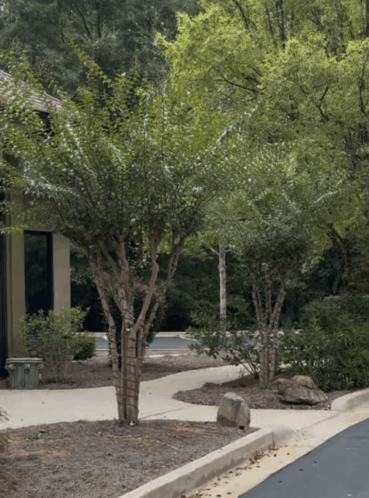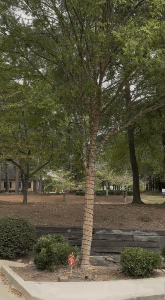 And then some other trees over here, wrapping them evenly so they don’t look too spread thin. But at nighttime, they’ll look really well lit up and full, as if they’re in the Christmas spirit.