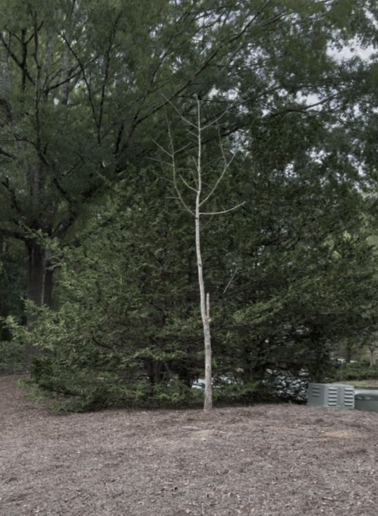 The trees in front were nice and filled full of lights. Taller trees right here, real skinny, nice spiral wrapping up the pole of the tree, the base of it.